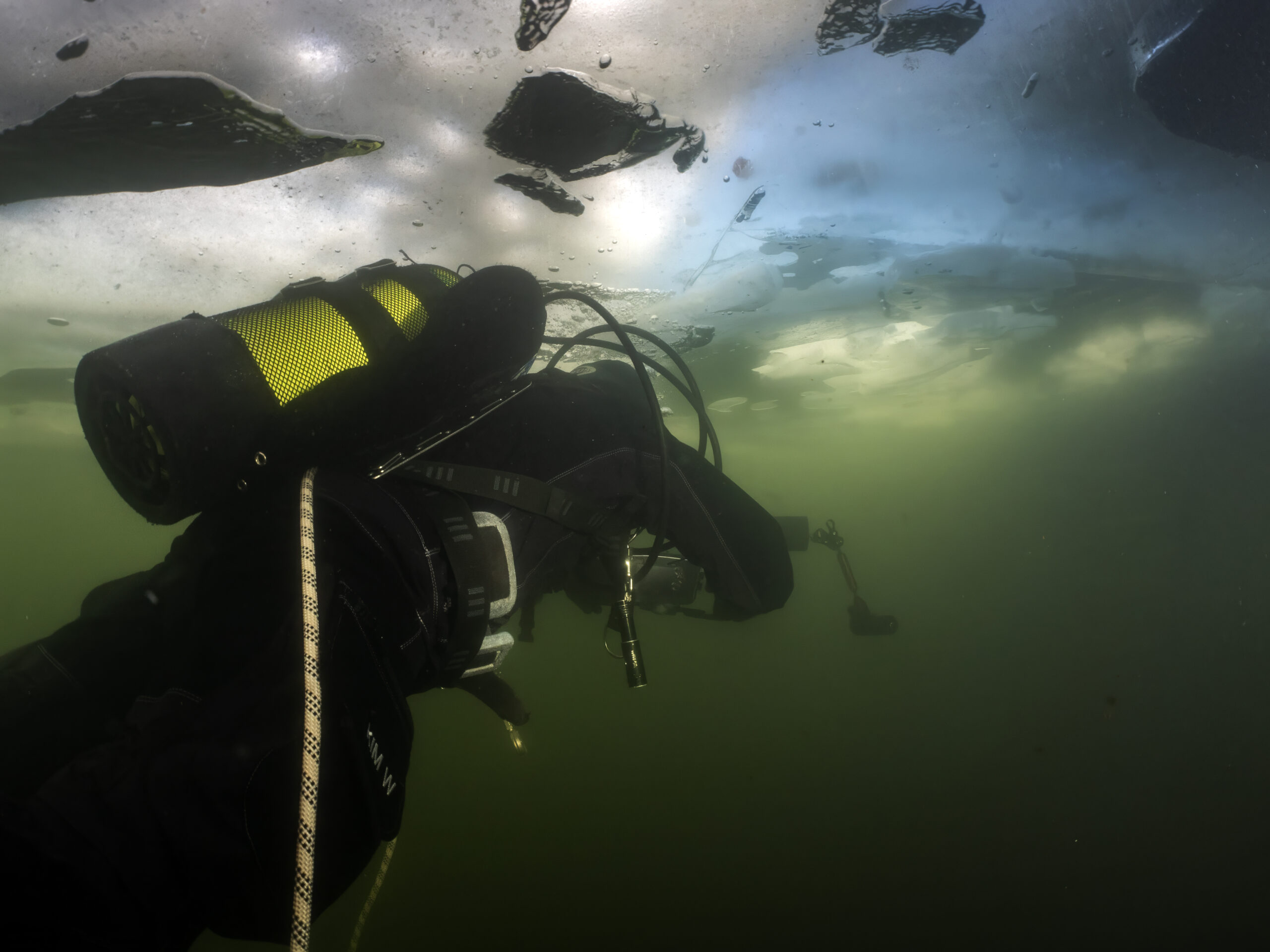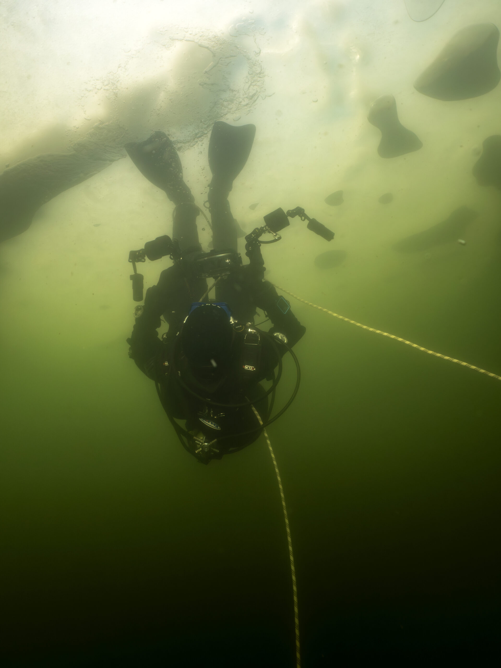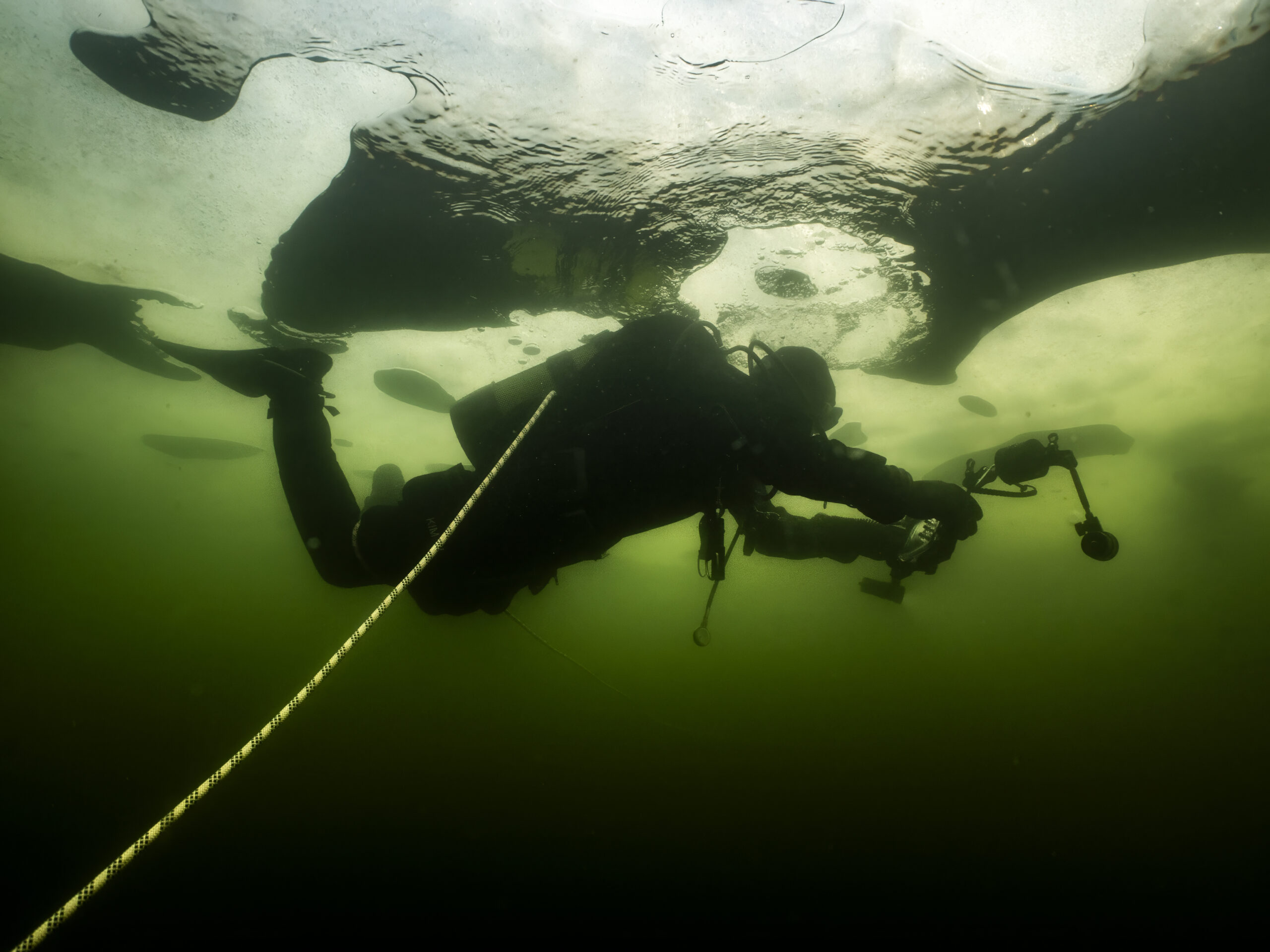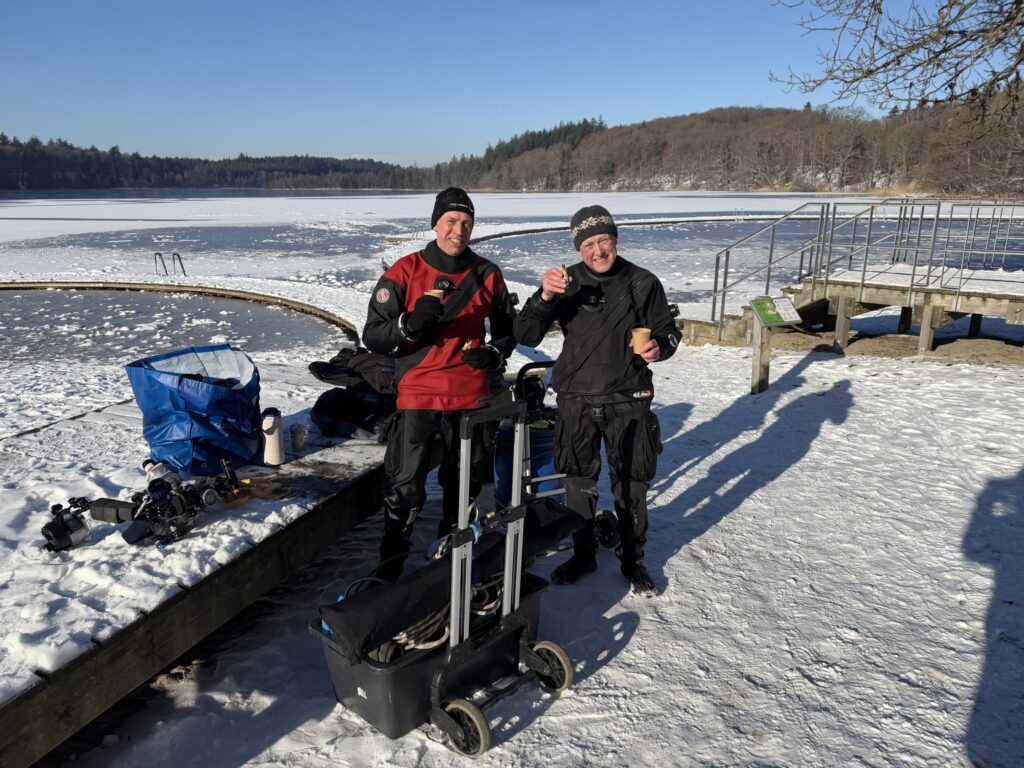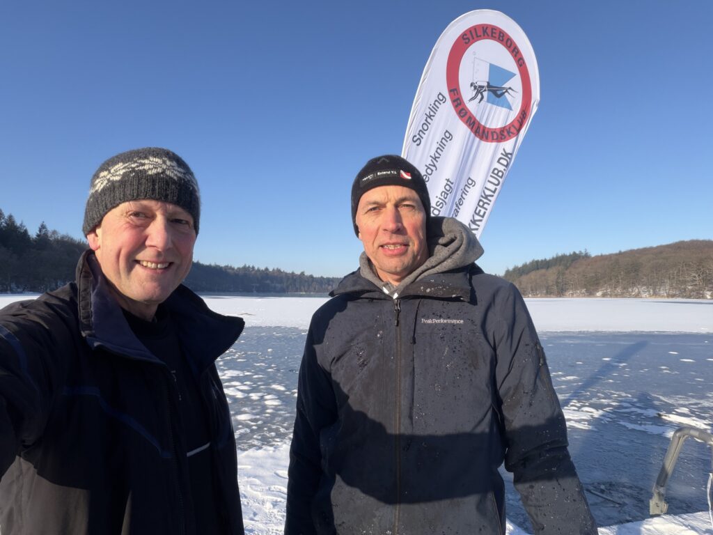 Henrik B og Kim W gentog isdyk lørdag den 14. februar med Henrik som undervandsfotograf og Kim som “fotomodel”. Vi var begunstiget af sol fra næsten skyfri himmel, så der kom mere lys ned end den forrige weekend. Hullet var frosset til, så økse mm måtte i gang for at lave hul igen. Henrik fik taget nogle rigtige fine billeder under overfladen – inklusiv Kim, der står på undertaget af isen :-))