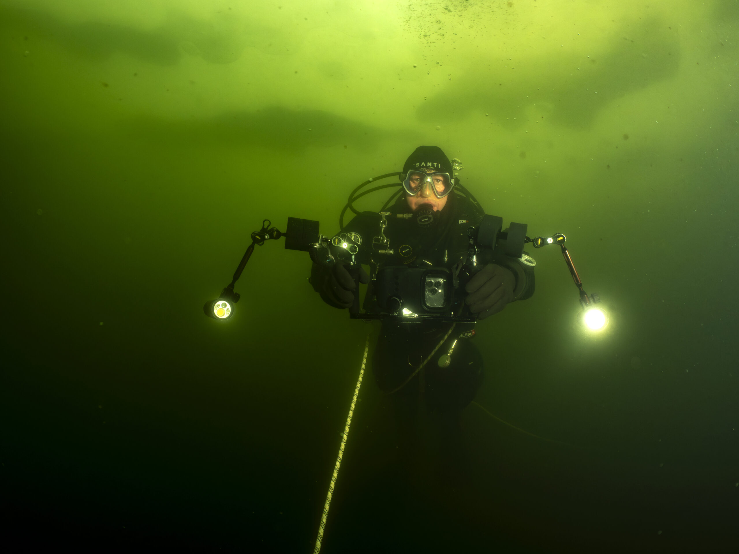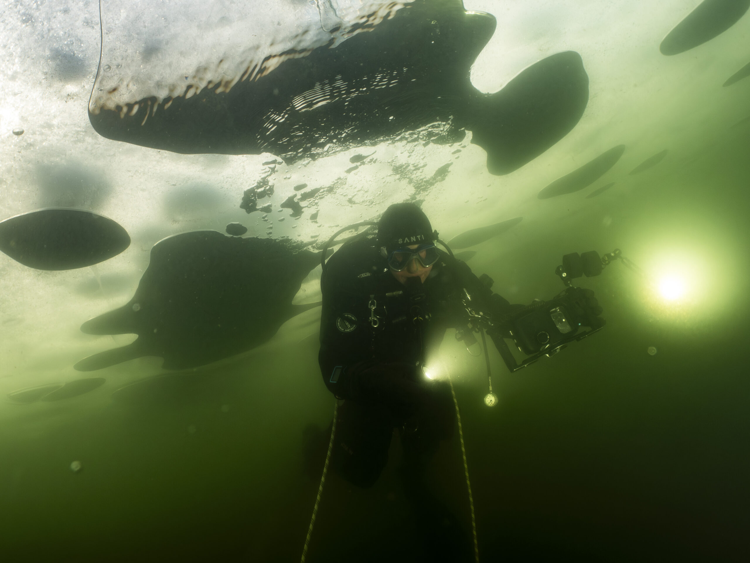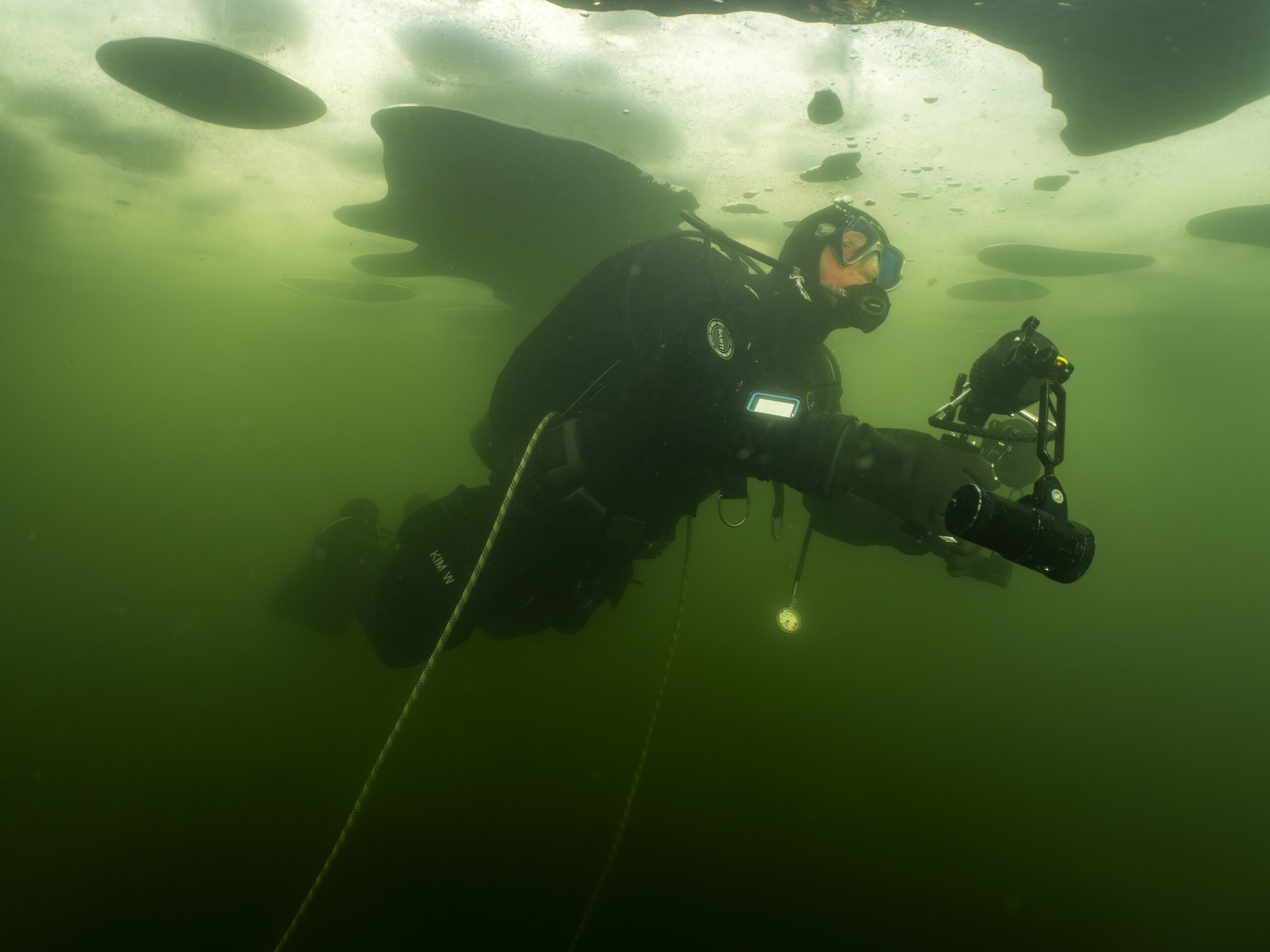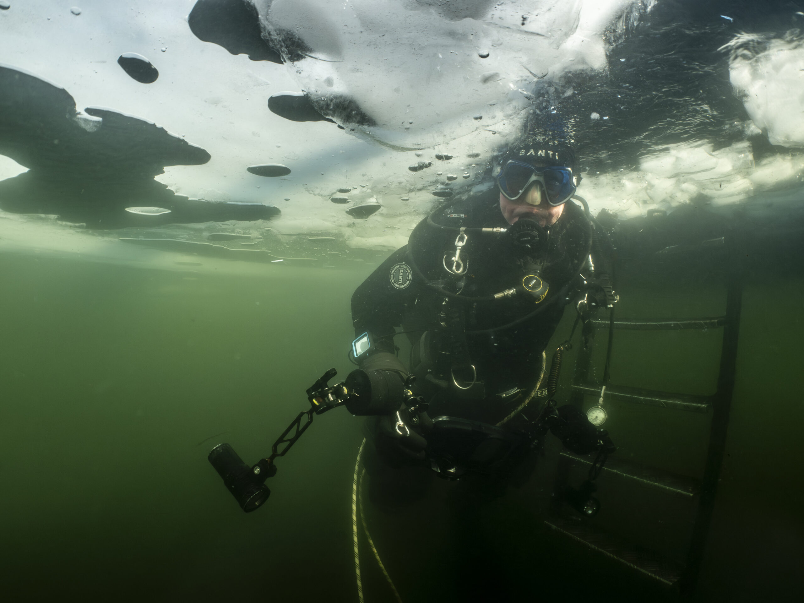 Henrik B og Kim W gentog isdyk lørdag den 14. februar med Henrik som undervandsfotograf og Kim som “fotomodel”. Vi var begunstiget af sol fra næsten skyfri himmel, så der kom mere lys ned end den forrige weekend. Hullet var frosset til, så økse mm måtte i gang for at lave hul igen. Henrik fik taget nogle rigtige fine billeder under overfladen – inklusiv Kim, der står på undertaget af isen :-))